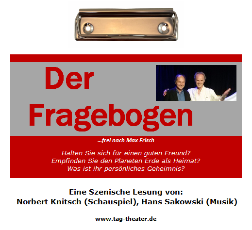 Norbert Knitsch (Schauspiel) in musikalischer Begleitung von Hans Sakowski dramatisierte diesen formell gehaltenen Fragenkatalog für die Bühne. Die Form der Umsetzung verleiht somit jedem Themenkomplex eine spielerische Leichtigkeit.